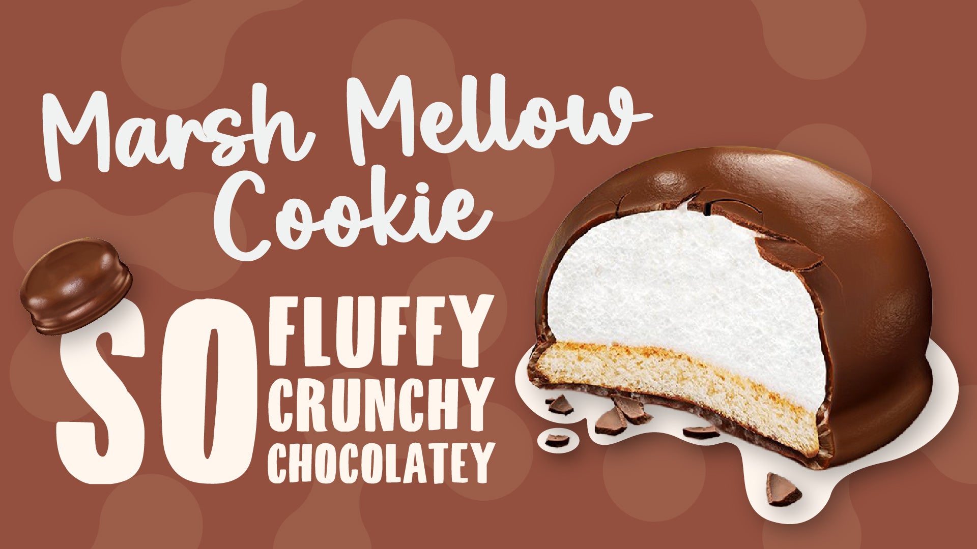 Snack time gets fluffier with Fluffy Bites Marsh Mellow Cookie! A crunchy vanilla cookie, a pillowy marshmallow, and a chocolate coating that ties it all together.